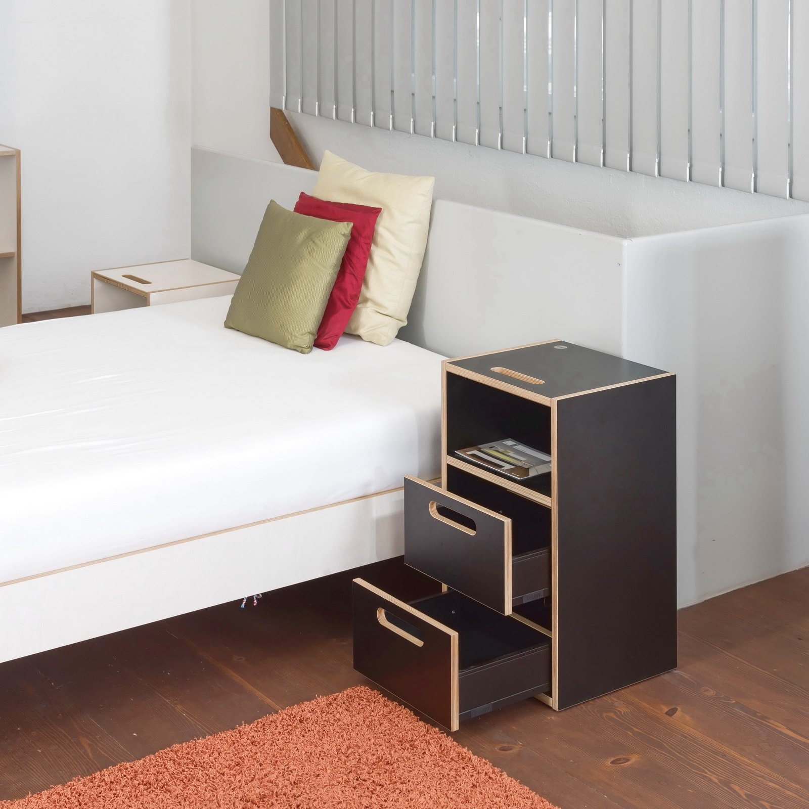 Die Aussenteile vom room³ Nachttisch sind aus schichtverleimten Holzplatten Sperracolor Birke 18 mm gefertigt. Die Kanten sind natur geölt oder lackiert. Neu auch Eiche furniert nat. lackiert erhältlich (auf Anfrage).