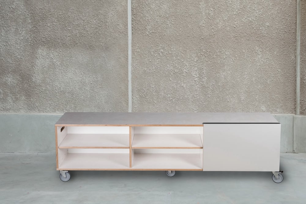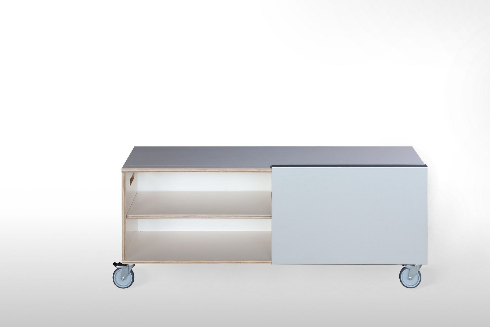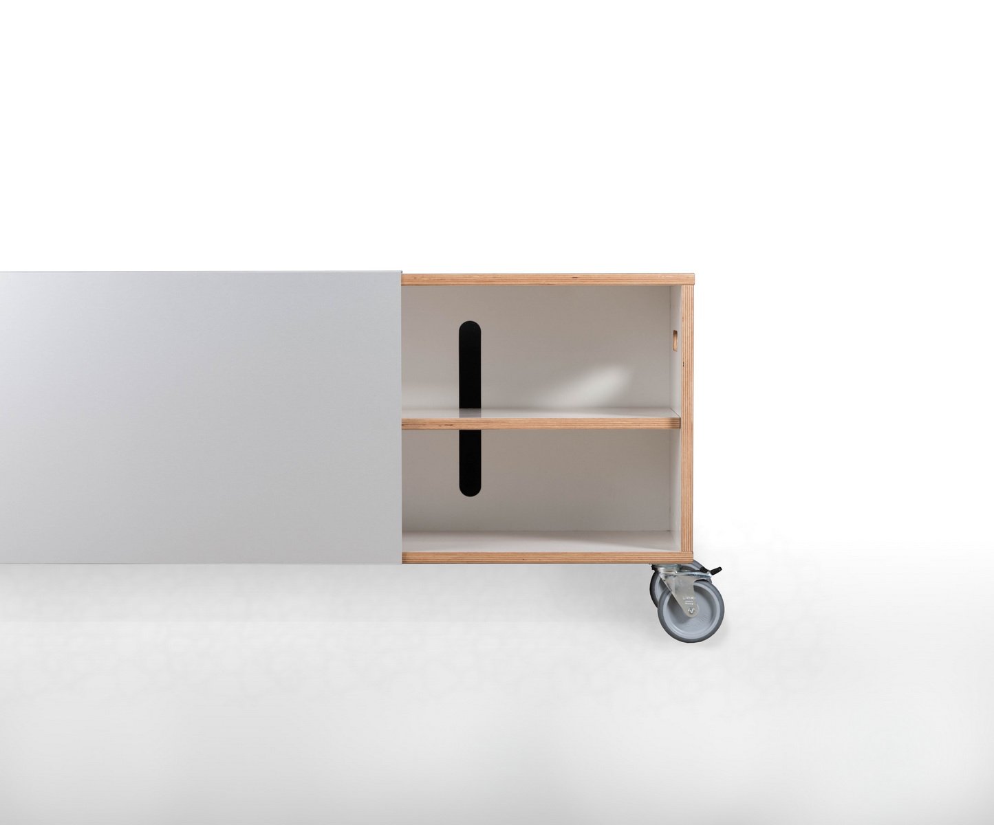 Es fährt vom alten Standort an einen neuen Platz. Je nach Vorliebe für die persönliche Einrichtung – stets am richtigen Ort. Die Schiebetüre des room³ Sideboards verdeckt den Einblick in die eine Hälfte. Die andere Möbelhälfte präsentiert Ihre schönsten Accessoires. Clever die Einfachheit der Bauweise und die 4 Nischen für Stauraum im Wohnzimmer, Gästezimmer oder im Büro.