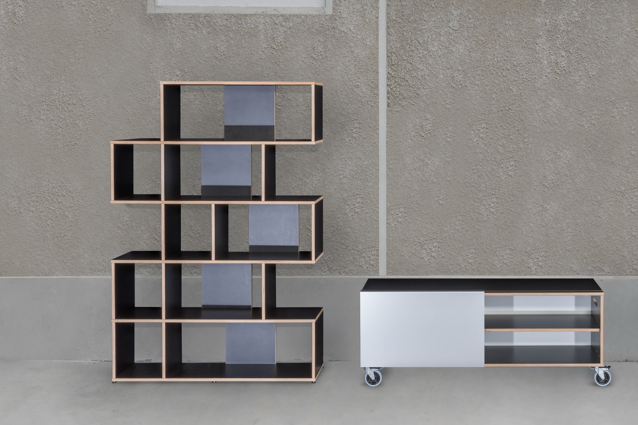 Die Front ist aus eloxiertem Aluminium. Sperracolor (weiss oder schwarz) geben dem Korpus Stabilität und das typische room³ Design. Neu auch Eiche furniert nat. lackiert erhältlich (auf Anfrage). Die Rückwand ist aus weiss beschichteter Spanplatte.